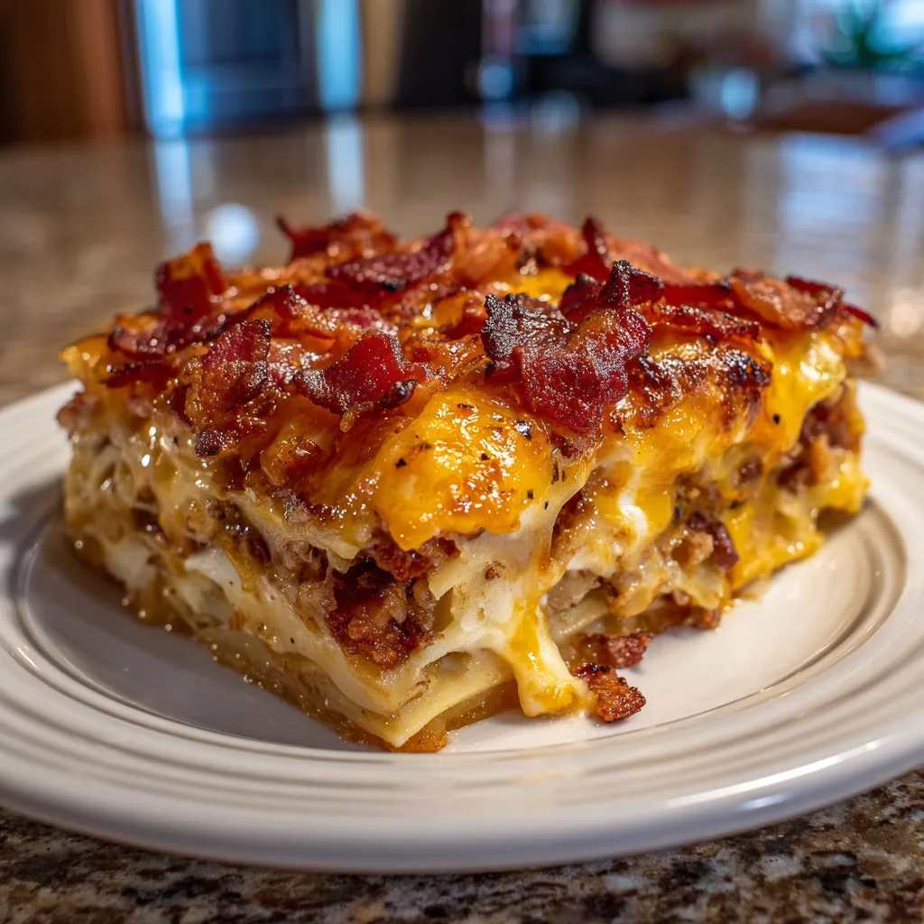 Bacon Cheeseburger Sheet Pan Lasagna brings playful creativity to traditional comfort food. It’s hearty, indulgent, and packed with bold flavor, yet simple enough for weeknight preparation. For a lighter variation, substitute lean ground turkey and reduce cheddar slightly while maintaining the layered structure. Whether served at a family dinner or casual gathering, this mashup delivers reliable crowd-pleasing appeal.