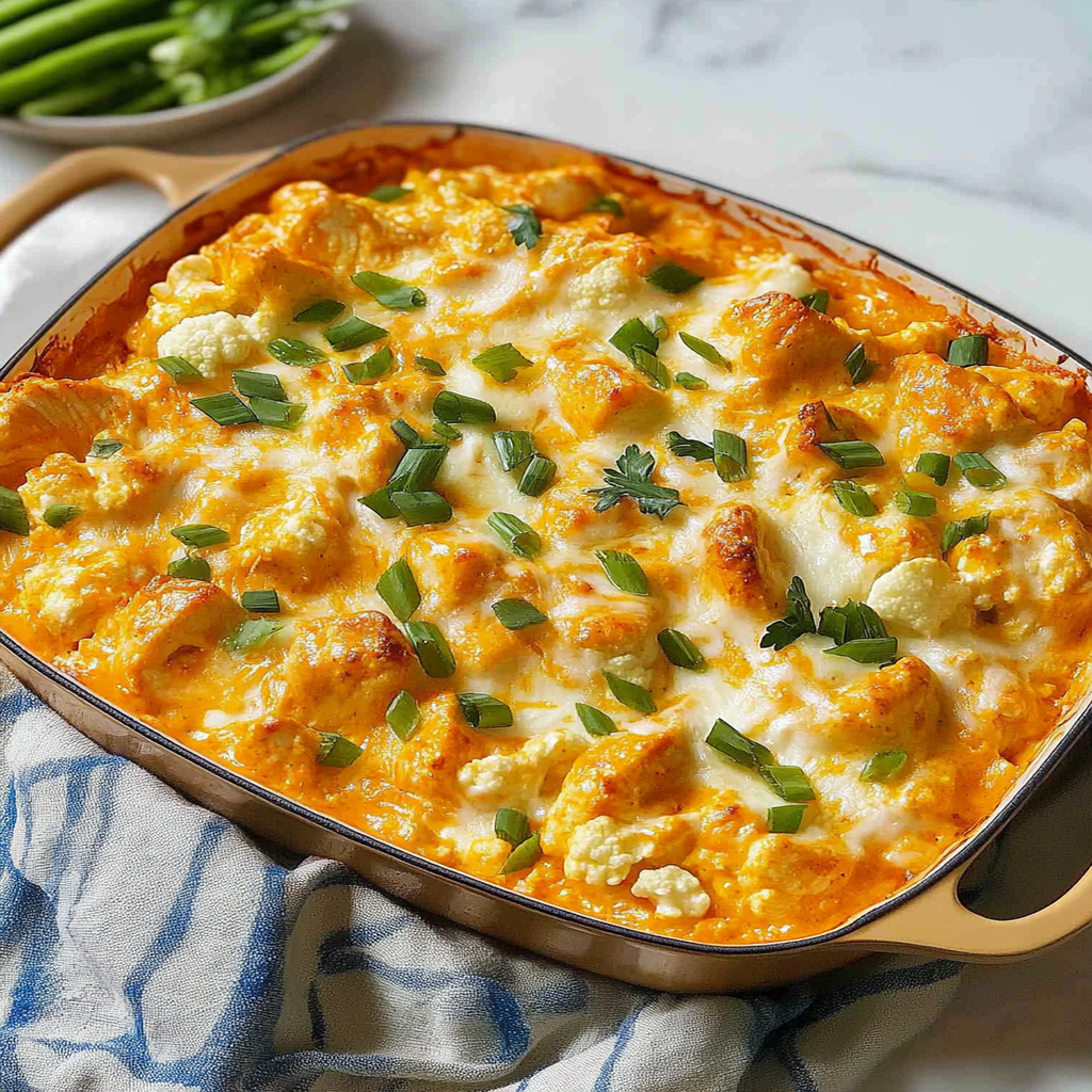Buffalo Chicken & Cauliflower Casserole is a bold, comforting dish that combines tender shredded chicken, roasted cauliflower, and spicy buffalo sauce in one satisfying bake. Cream cheese and sharp cheddar create a rich, creamy base, while fresh green onions add brightness and crunch. Perfect for game day or weeknight dinners, this casserole delivers big flavor with a balanced, low-carb twist.