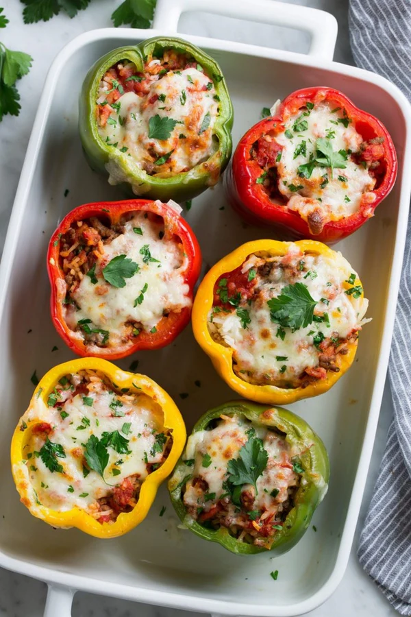 Stuffed Peppers are a classic comfort dish featuring tender bell peppers filled with a savory mixture of seasoned ground beef, rice, vegetables, and tomato sauce, then topped with melted cheese. This version balances hearty protein with fresh vegetables and finishes…