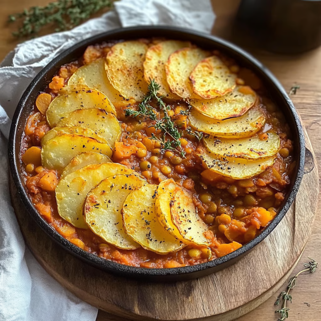 Easy Vegan Hotpot Lentils is a comforting, plant-based bake featuring a savory lentil and vegetable base topped with thinly sliced potatoes that roast to golden perfection. The lentils simmer in a rich tomato-herb sauce before being layered beneath overlapping potato slices for a rustic, hearty finish. Baked until bubbling and crisp on top, this hotpot delivers satisfying texture and depth—completely dairy-free and nourishing.